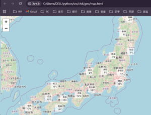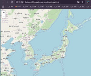 プログラムfolium_test.pyを実行すると「map.html」というファイルが生成されているので、これをブラウザで開くと日本地図が表示されます。