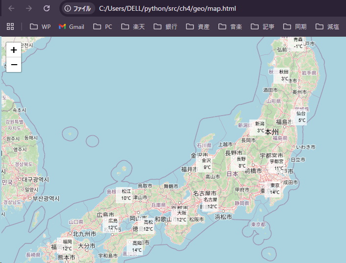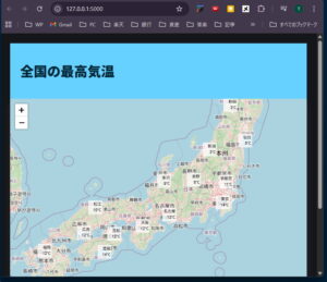 http://127.0.0.1:5000にアクセスして最高気温付きの日本地図を表示させます。